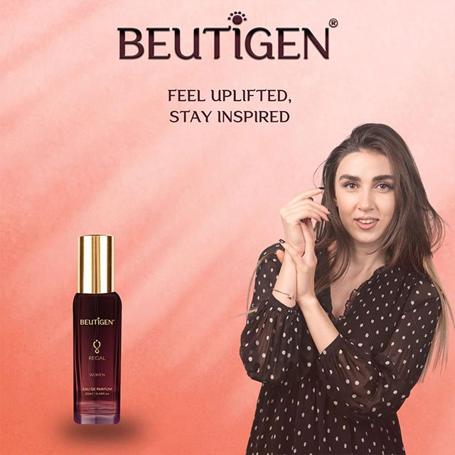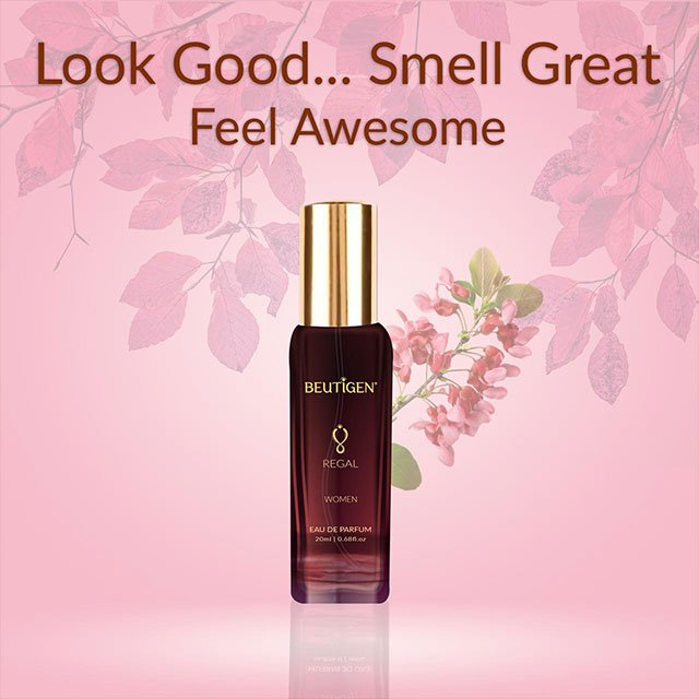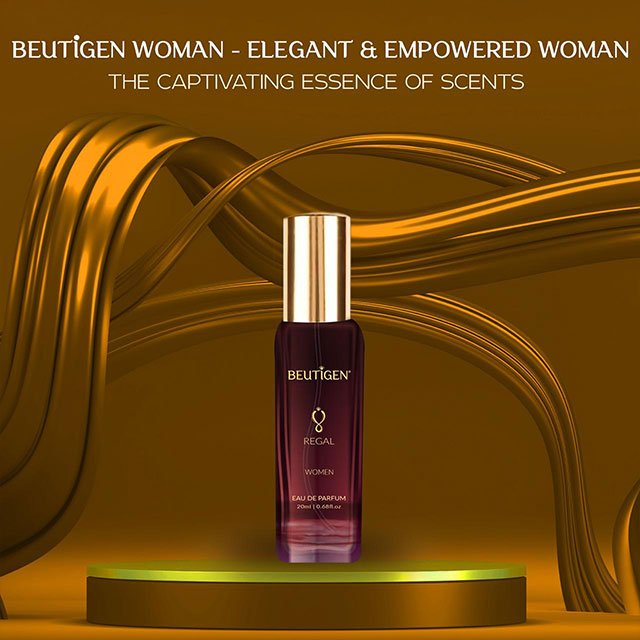 Presentation: 100 ml and 20 ml packs in colored printed glass bottles with spray pump, crimp and press cap. Burgundy – brown color shaded bottle with gold color print. Bottles are packed in individual shrink sleeved monocartons.